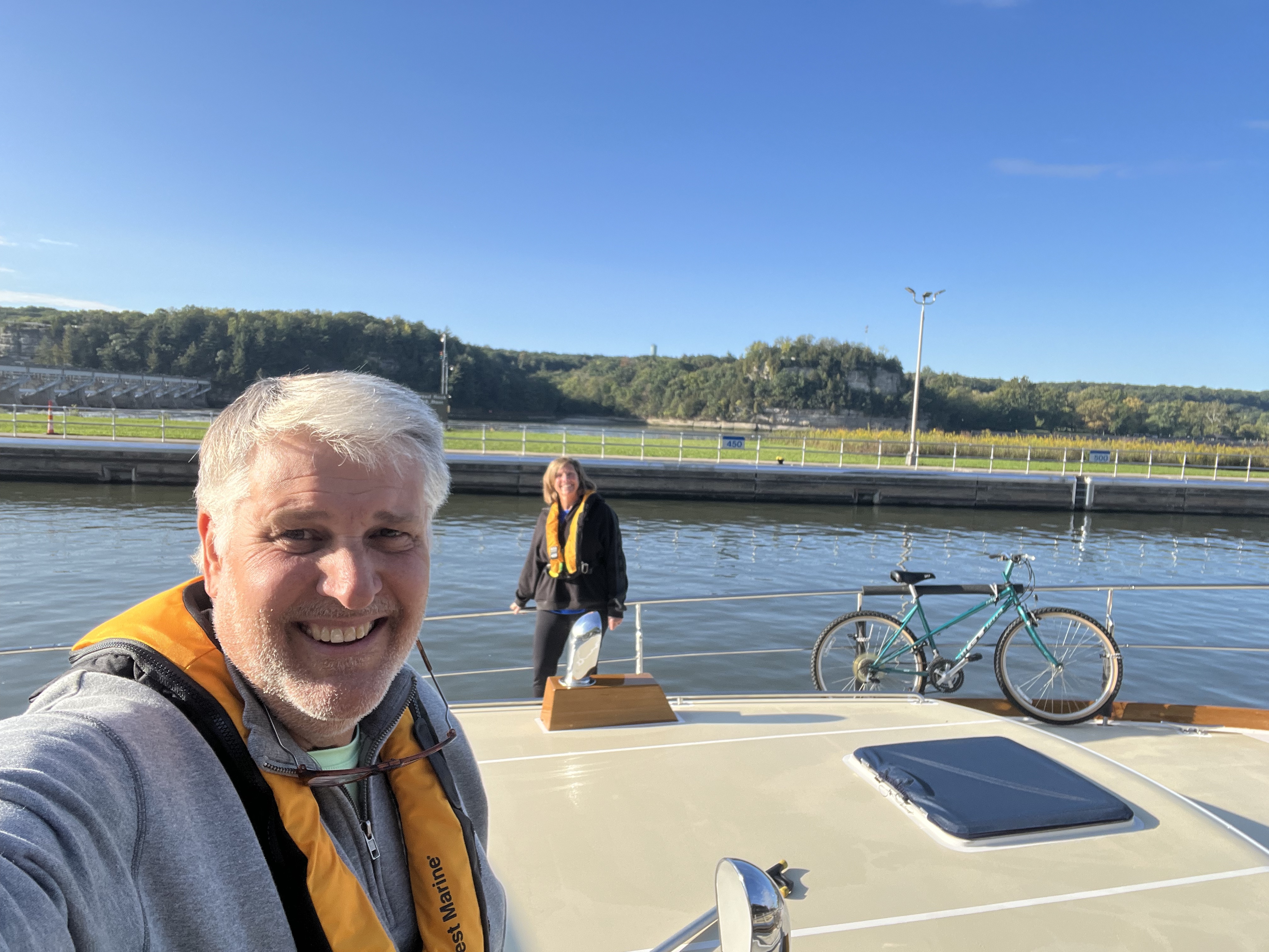 First, and only, lock today was Starved Rock Lock and Dam. It was about 11 miles downstream and we arrived just as they were closing the doors with only 3 boats in the chamber. We arrived with 10 boats, as our official flotilla is over.