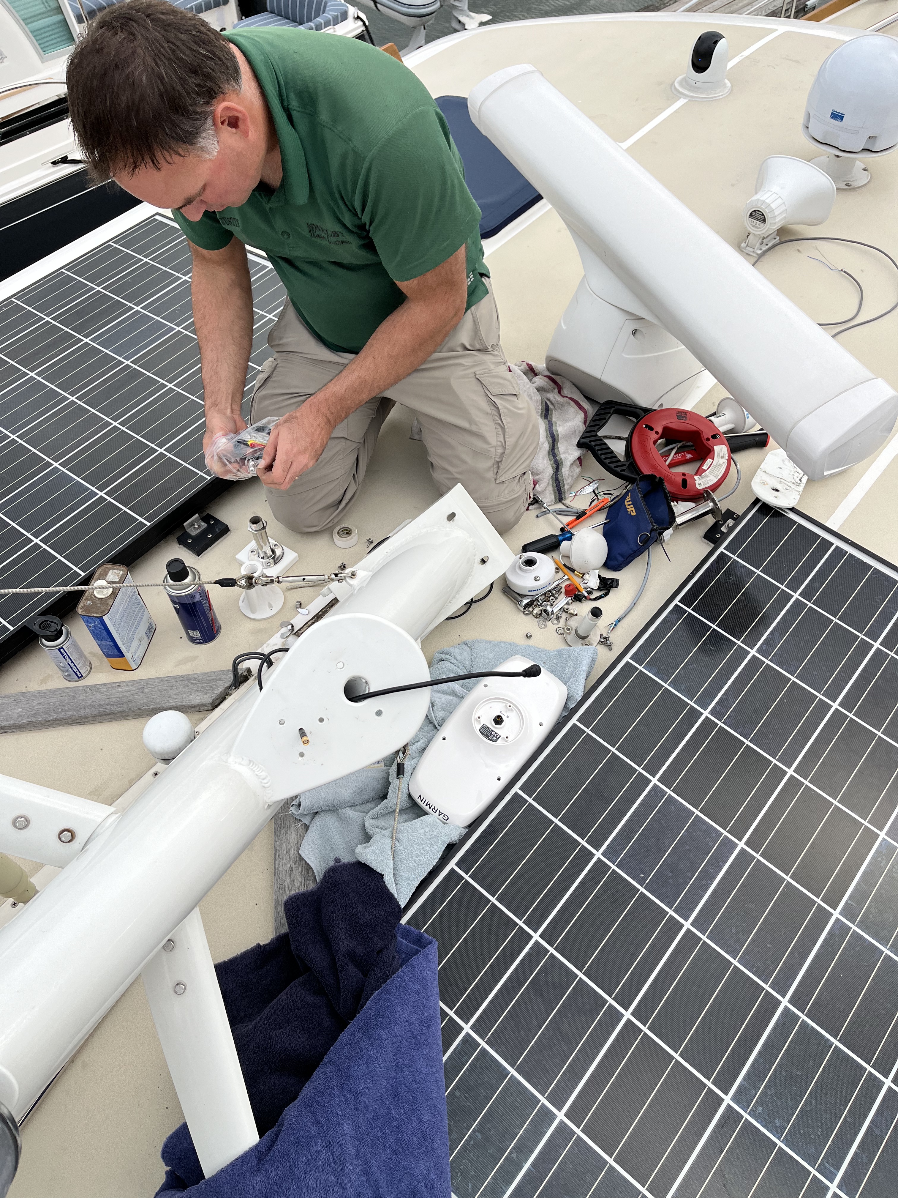 After adding all new electronics to the boat over the last two years, the system was not working properly. I spent some time on the phone with Garmin’s engineering department and they were able to figure out what was going wrong. Should be an easy fix by adding a satellite compass to correct any electrical interference. Sounds simple! I was able to find a certified Garmin installer in the area and he was on the same page as the Garmin engineer. A great sign! Well, the simple install of the satellite compass has turned into running new cables all through the boat, replacing a rudder feedback sensor, and replacing both antennas on the roof of the boat. To do this, we pulled out all the old cables and wires, and ran all new! He and I are 15 hours into this project and still have to sea trial everything tomorrow morning! Hope it all goes well!