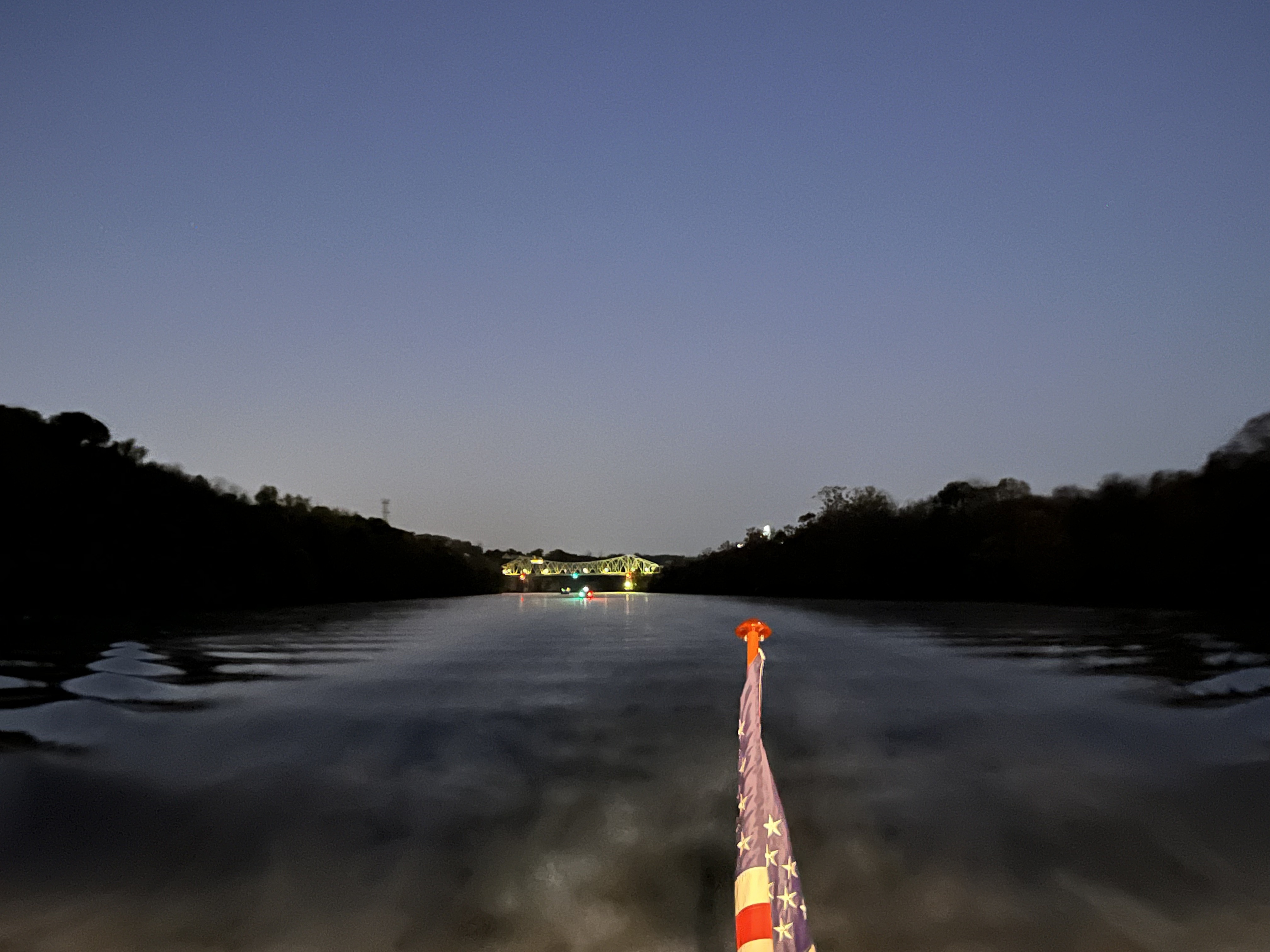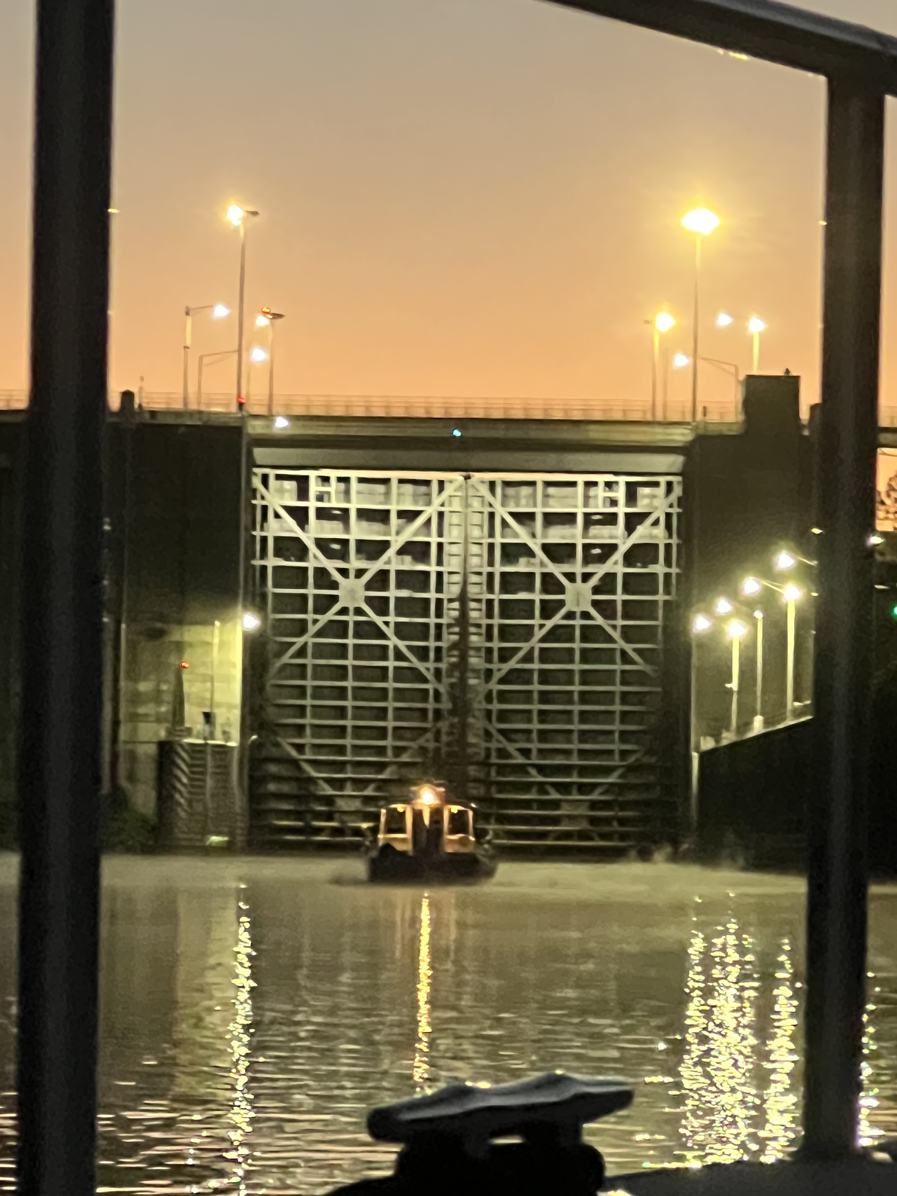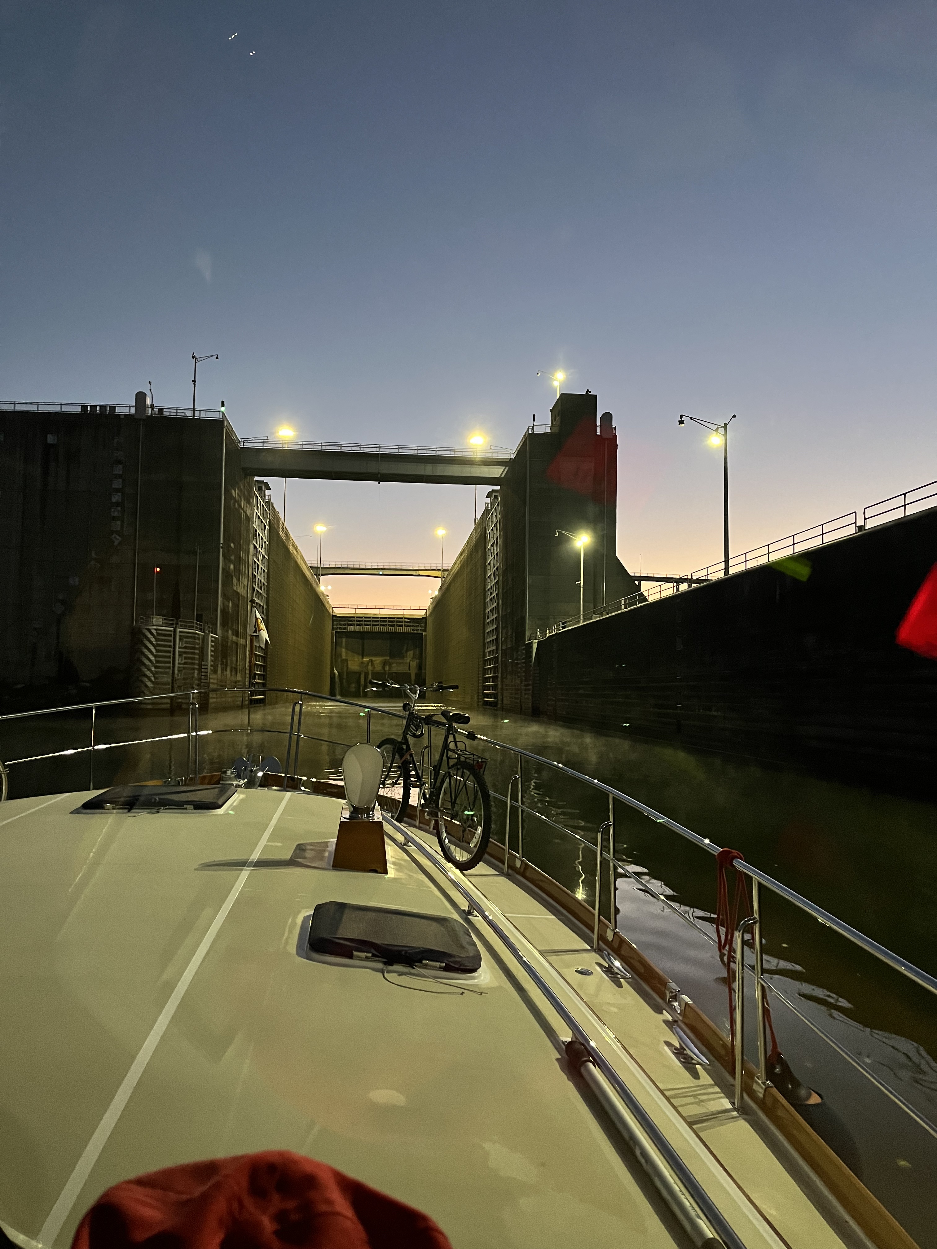 Today brought our next challenge on the Loop. We had two locks to go up bound through. The Wilson Lock was a 94′ lift and The Wheeler Lock was a 72′ lift. The only catch was we had to lock through the first one, Wilson Lock, before sunup. There has been some damage to the lock, so commercial traffic has all day light hours!