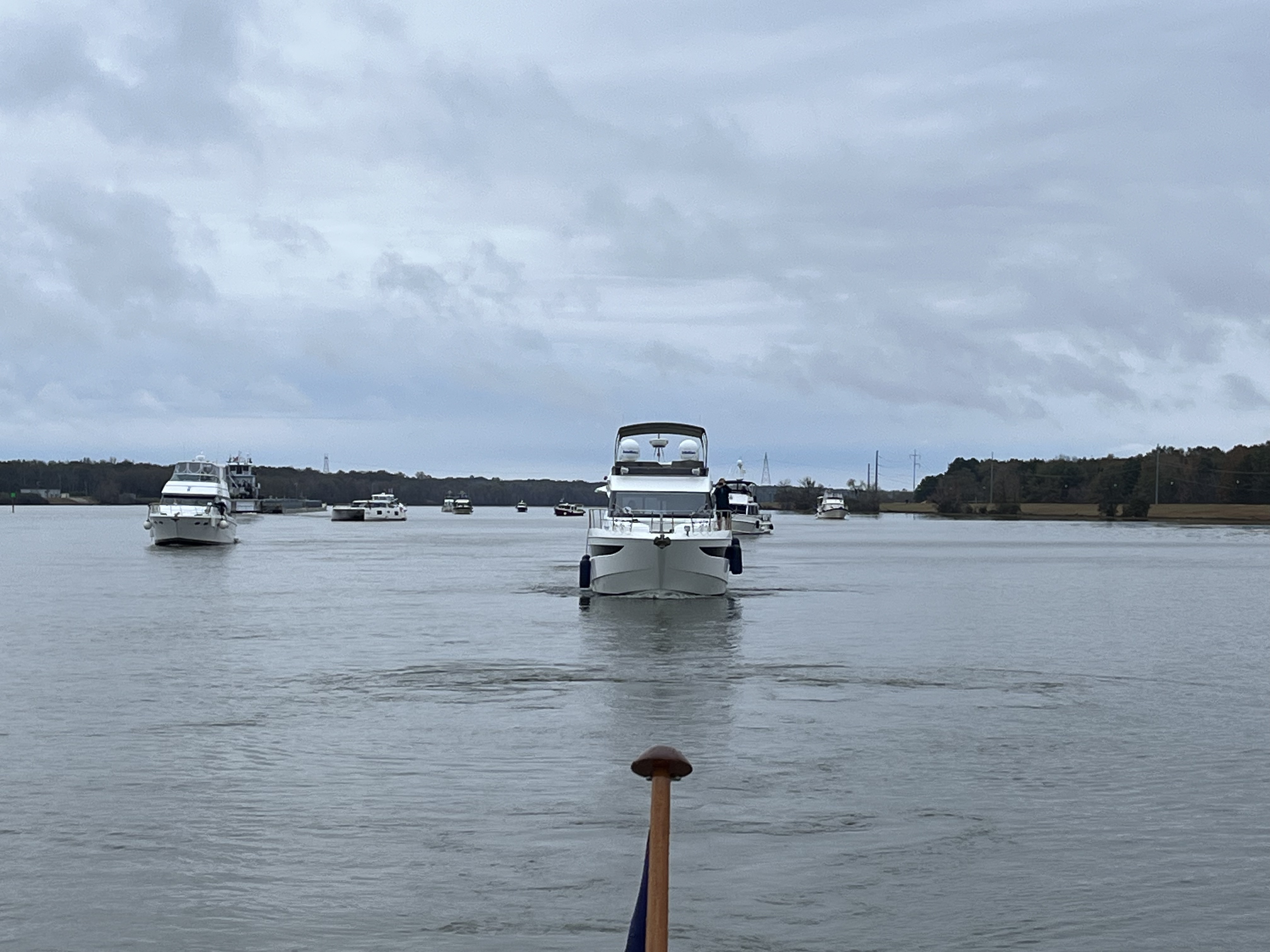 Day two was from Fulton MS to Columbus MS. This was another 60-mile day. We had to wait to leave the marina due to barge traffic. This would mean we could run out of daylight! We pulled out at 7:30am in the rain and arrived at Columbus Marina at 3:45pm. The only way to make it in the daylight was to run hard for the last 20 miles. We followed Wes, and two other boats followed us. We ran the river at 25MPH for just short of an hour. The engines liked it for a change, but it was tough on my nerves watching for logs and shallow spots at that speed. Unfortunately, only 6 boats from our group had enough speed to make it to the marina in daylight. It is a very tough entrance into the marina pool and into the marina, so they advise not arriving in the dark. They actually have a guy on the radio coaching you into the marina the entire way from the main channel. The other boats had to find a hole to anchor in off the main channel.
