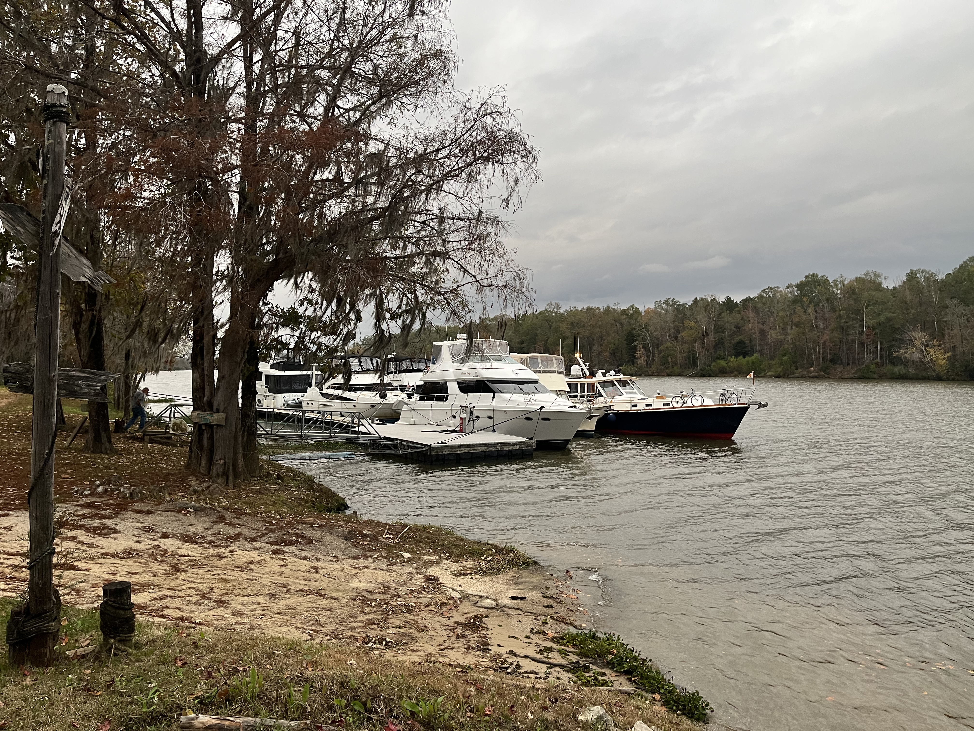 We left Demopolis at 6:40am to make another lock and ran 96.6 miles to Bobby’s Fish Camp. This is a famous Looper stop, not sure why. The restaurant is closed, and the dock is a 140′ strip along the shore. We arrived at 3:45pm with a storm approaching.