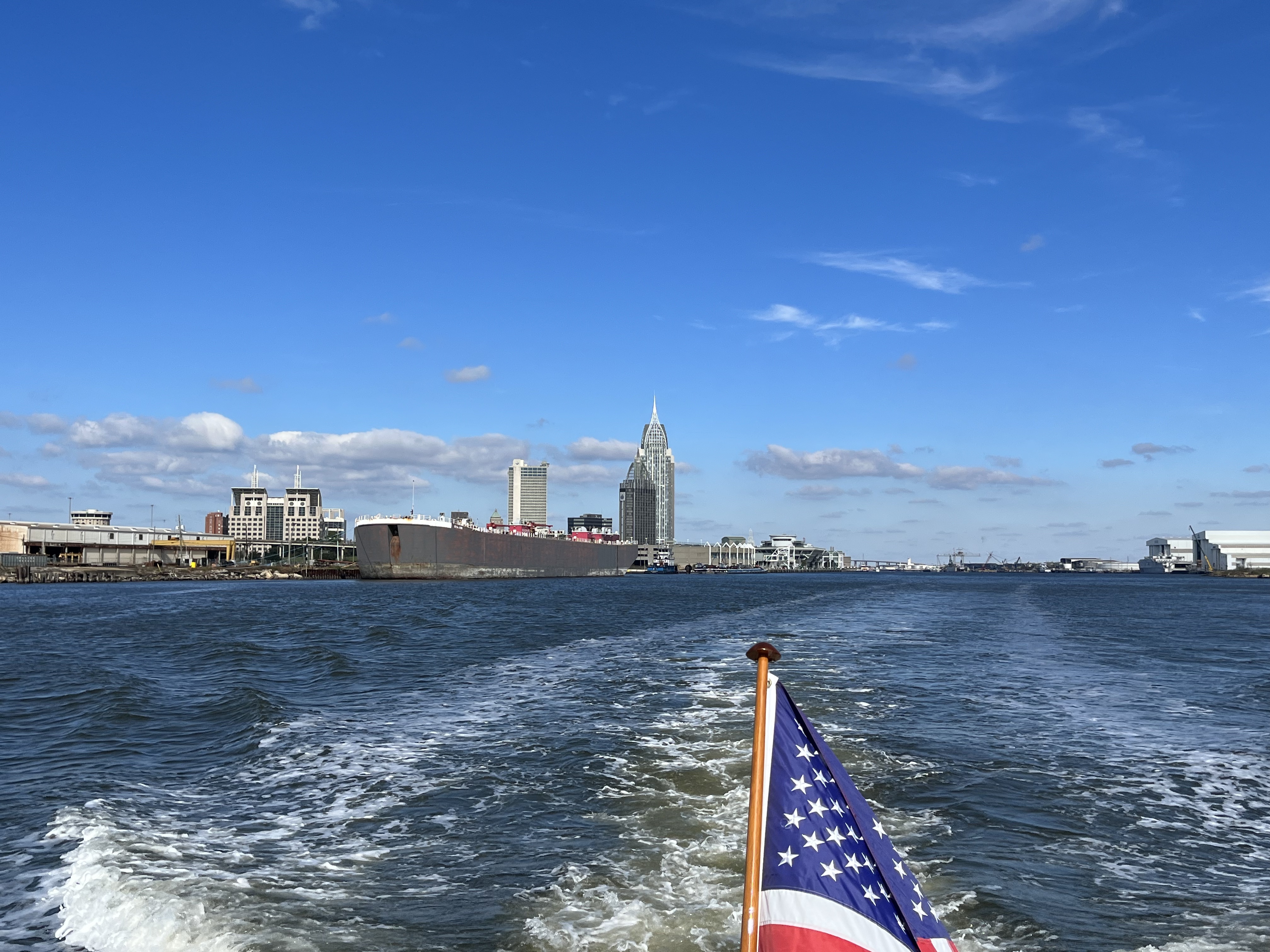 Downtown Mobile on the right and the shipyards on the left. There is a lot of ship building and industry on the Mobile River.