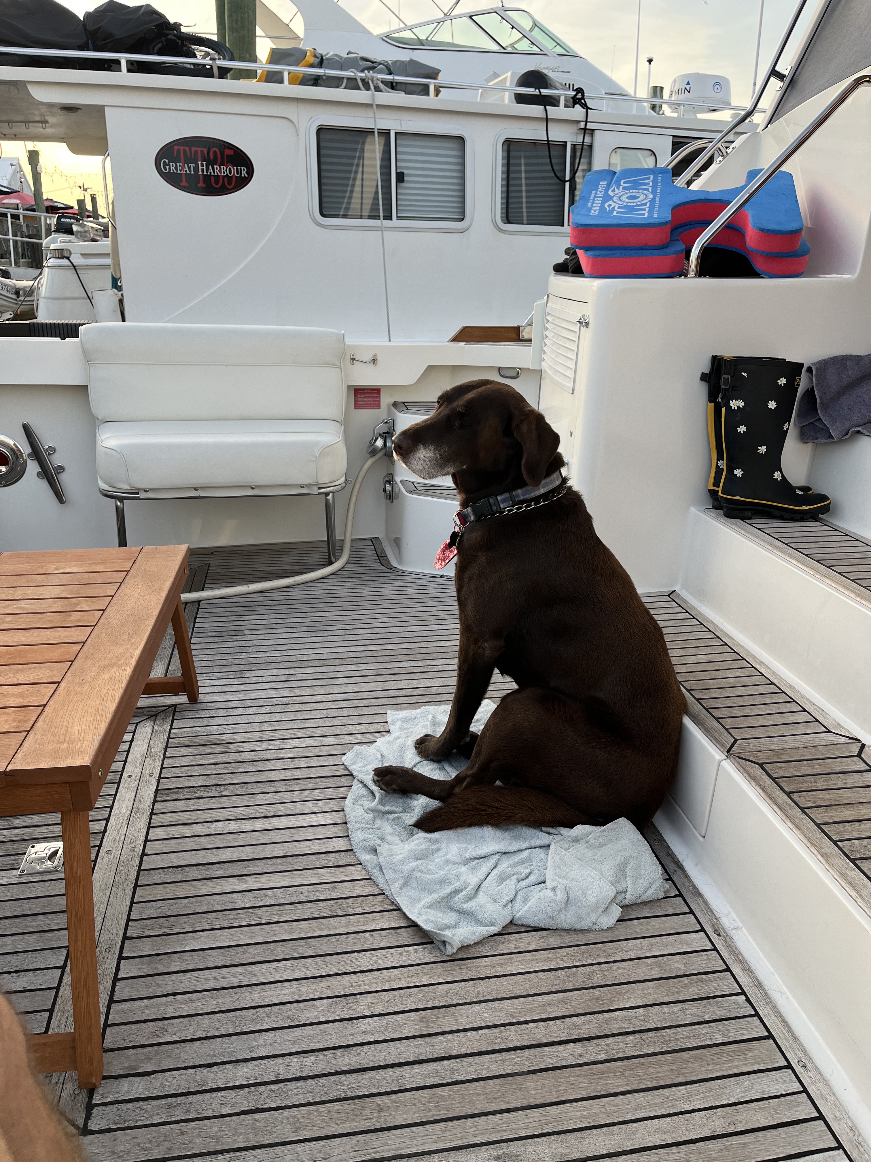 Memphis is not allowed to relax on the bow, so she has her towel out back and she loves it out there.