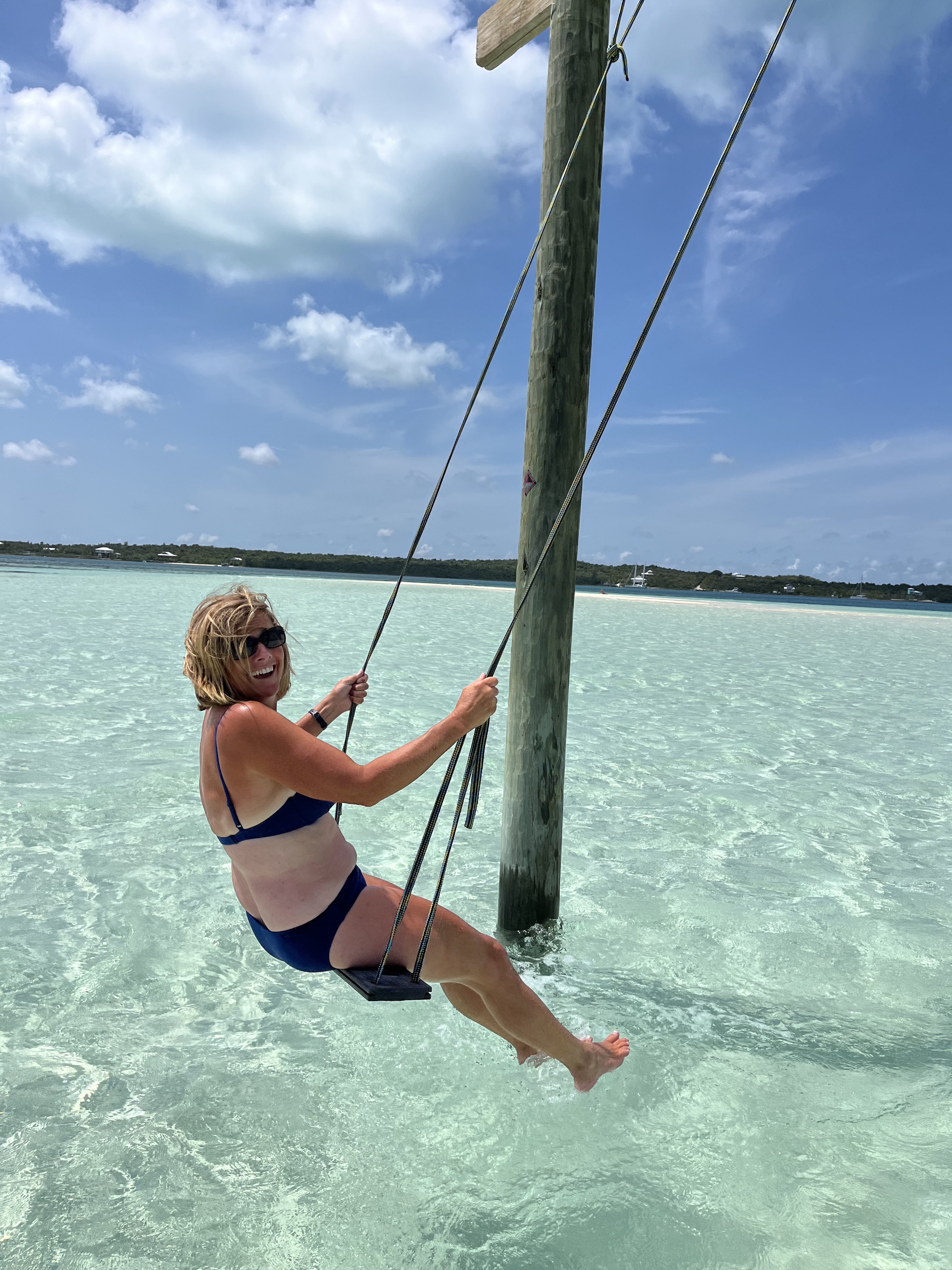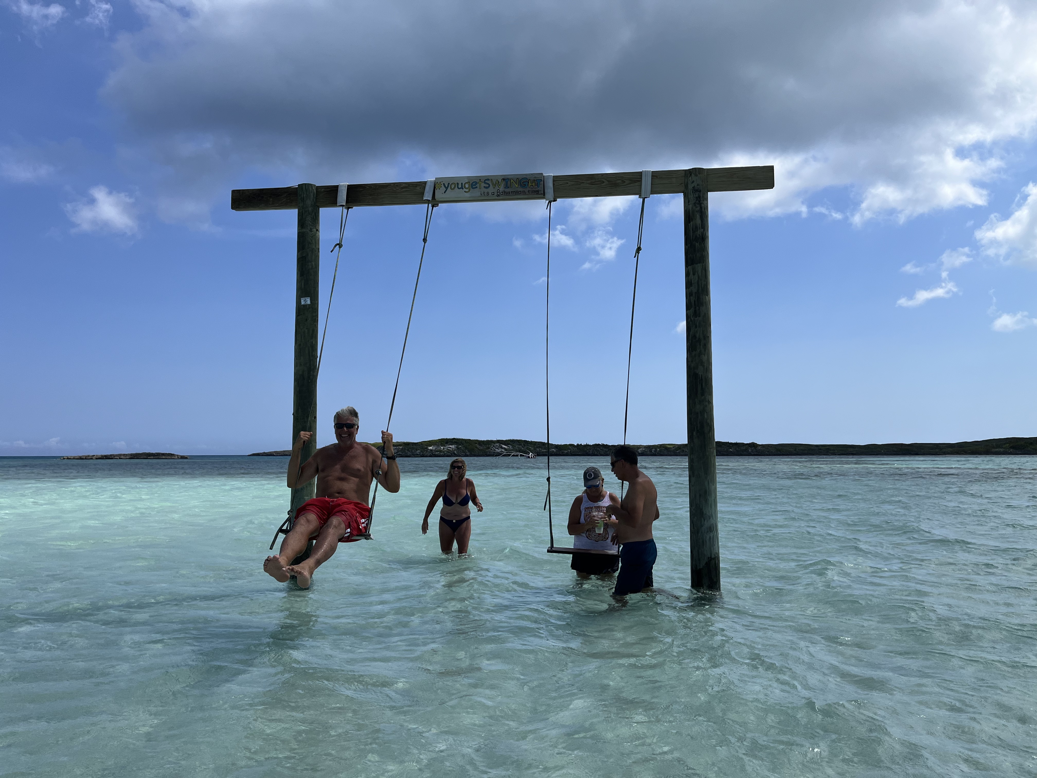The next day was sunny and nice so we took the dinghy to Tahiti Beach on the south end where a food and drink boat comes onto the sand bar and the party starts! There were many people and boats on the sand bar, as well as a swing in the middle of the bar.