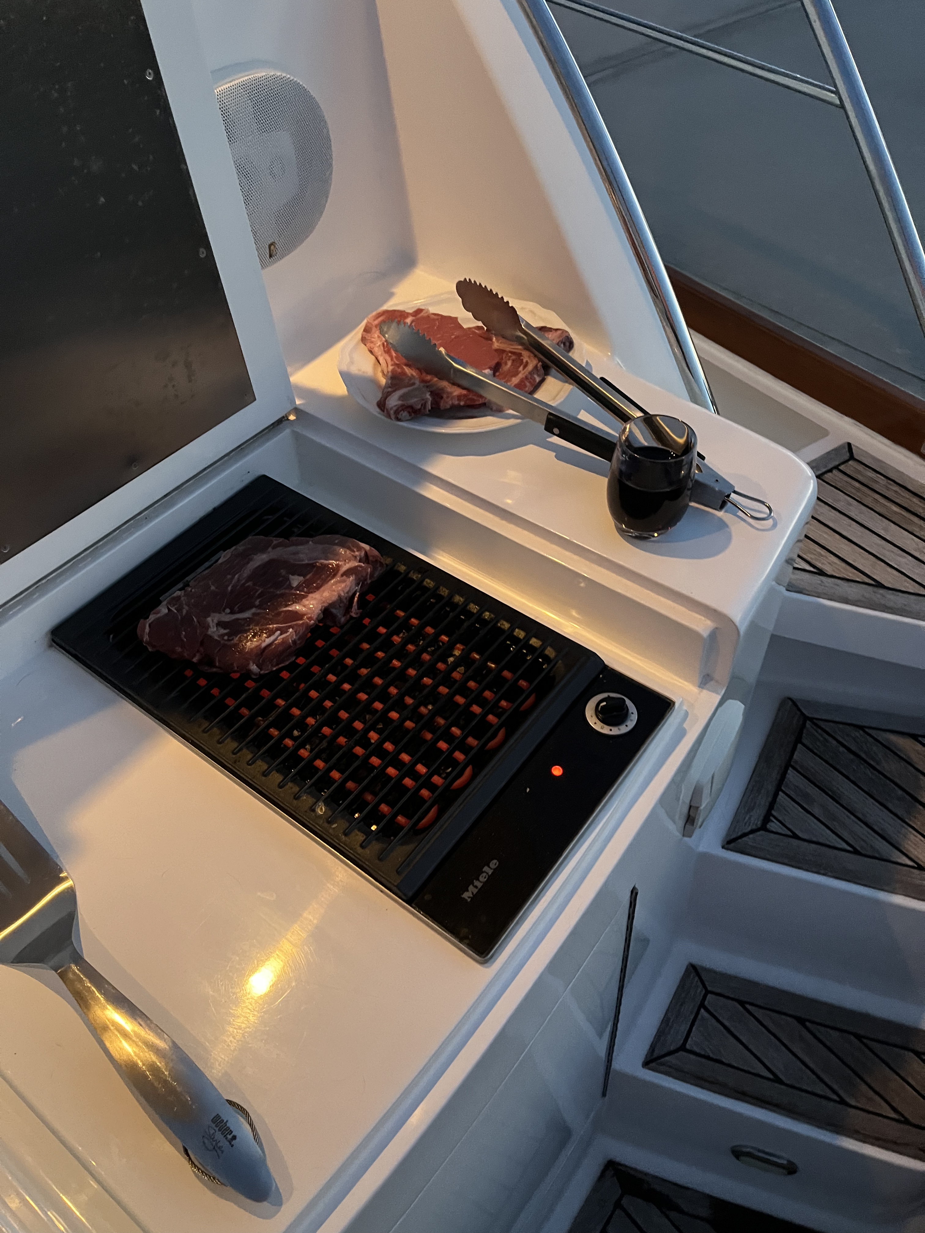 Dinner the first night back with a couple steaks and one of our last good bottles of wine to celebrate our safe Bahamian adventure.