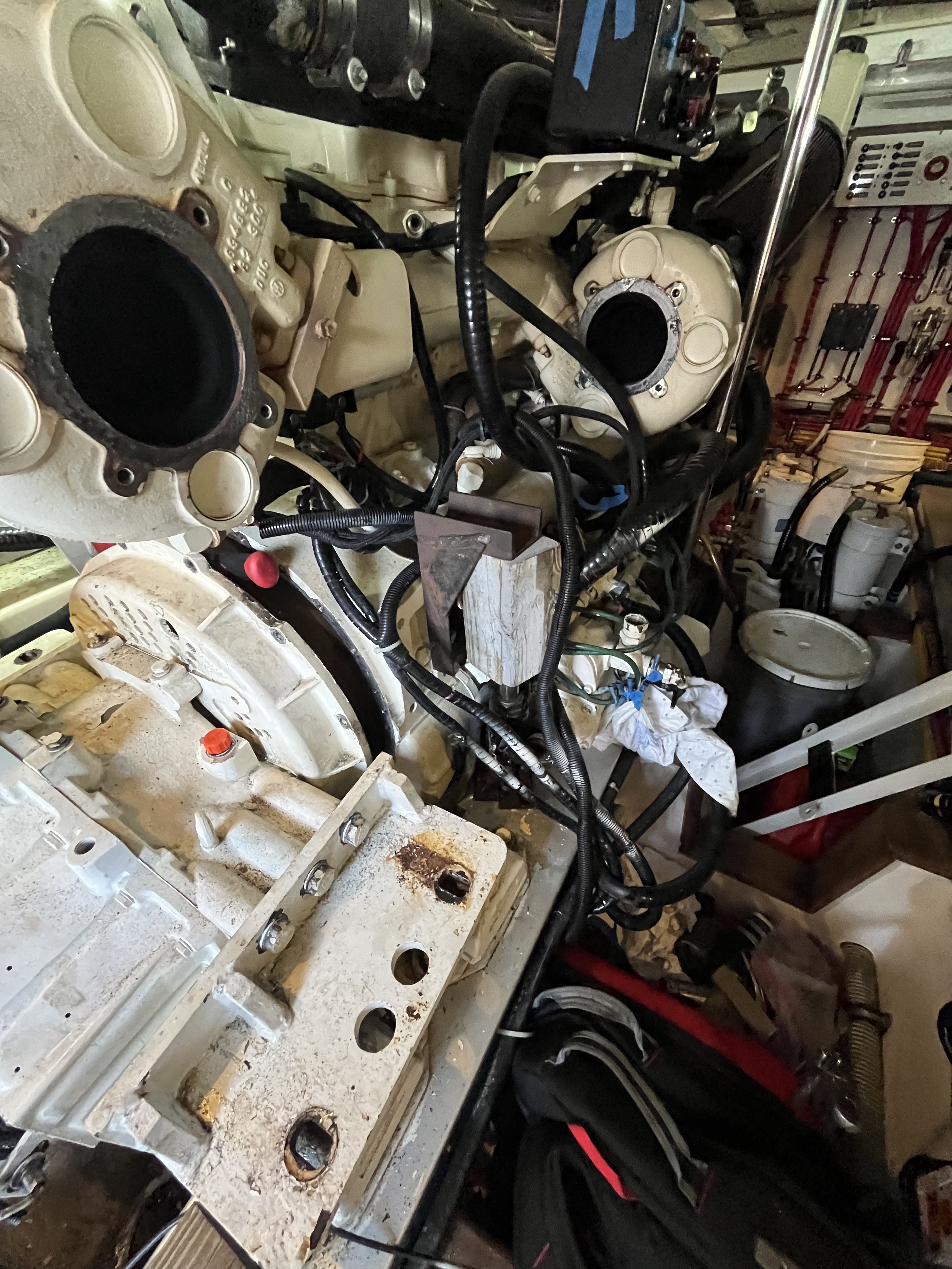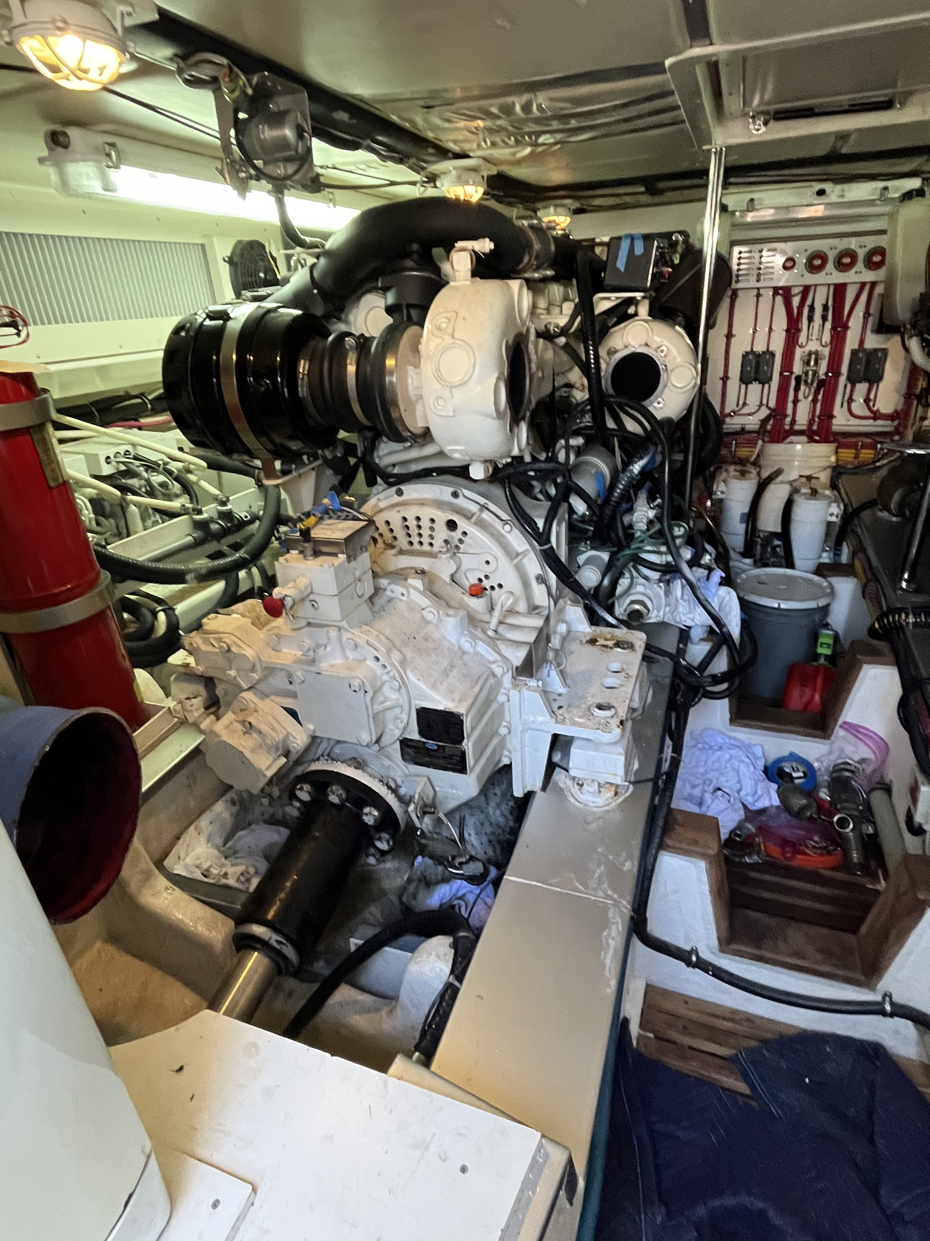 The engine is lifted, the shaft is unhooked, the turbos are disconnected, the transmission is separated, the fireboy system is removed, and she is ready to have the frame built inside the engine room to lift the transmission and get it to the center of the engine room so it can be lifted out with a boom truck.