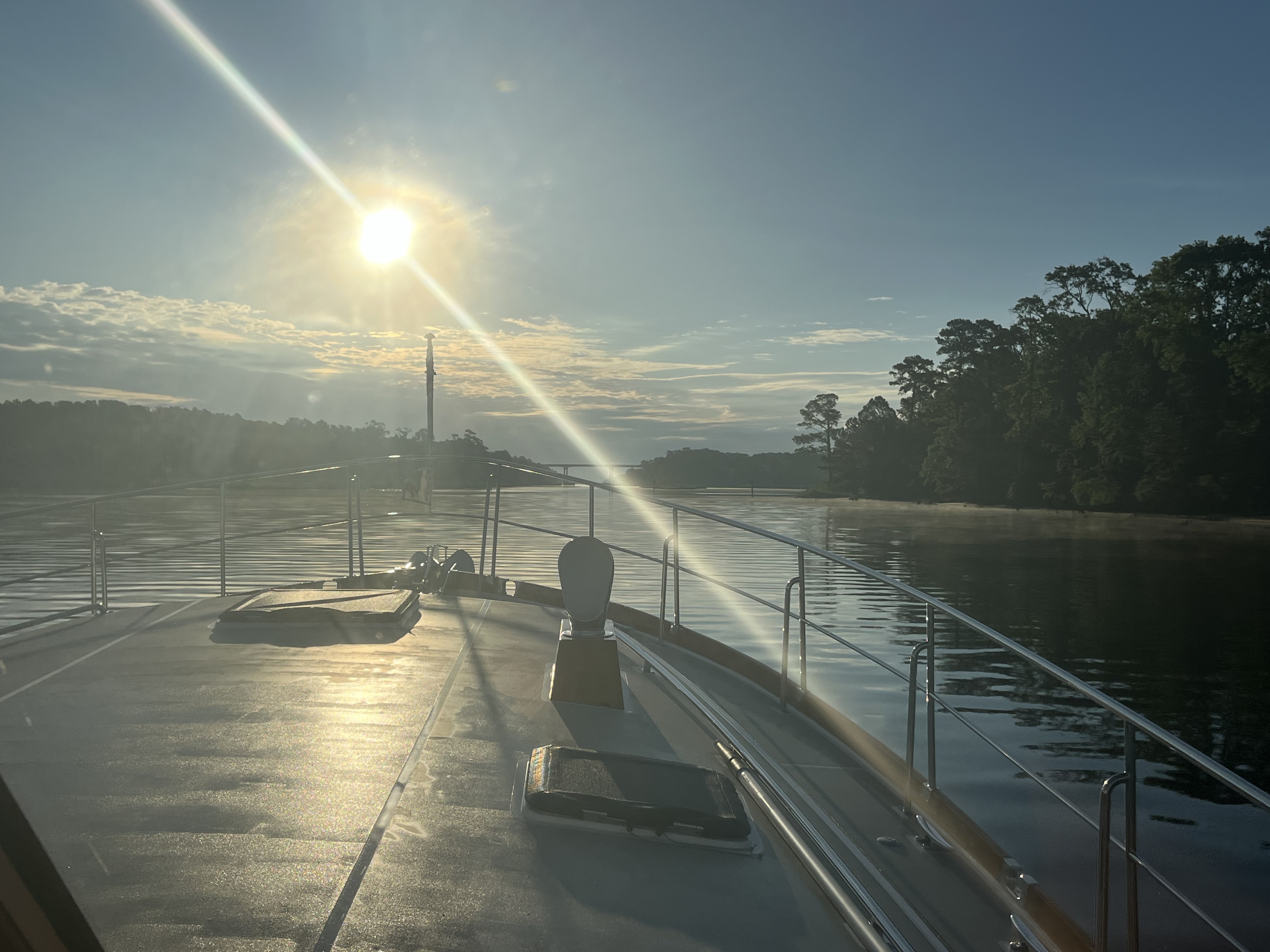 We needed to be in Coinjock around noon on Monday so the mechanic from ADR Transmission could start to assess the oil leak. They are working very hard for us to get this solved, so I had to do my part to be here on time. This meant we would run fast most of the way which is not fun for me in new skinny, narrow water. We were warned to watch out for the cypress stumps along a 20 mile narrow canal. That was fun.