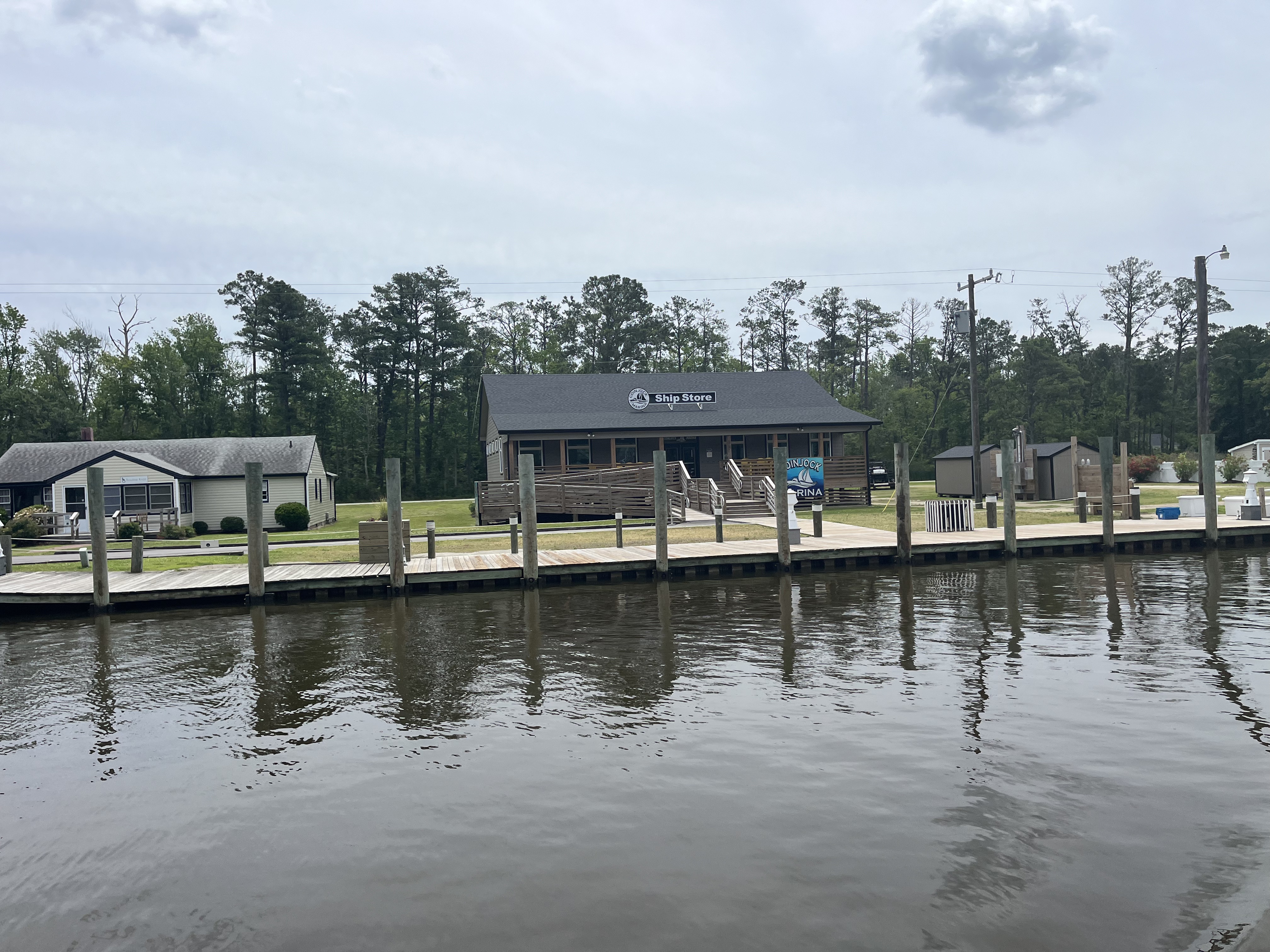 Arriving in Coinjock. The marina is a long wall along the street. This is the entire town. They are famous for their prime rib dinner though.