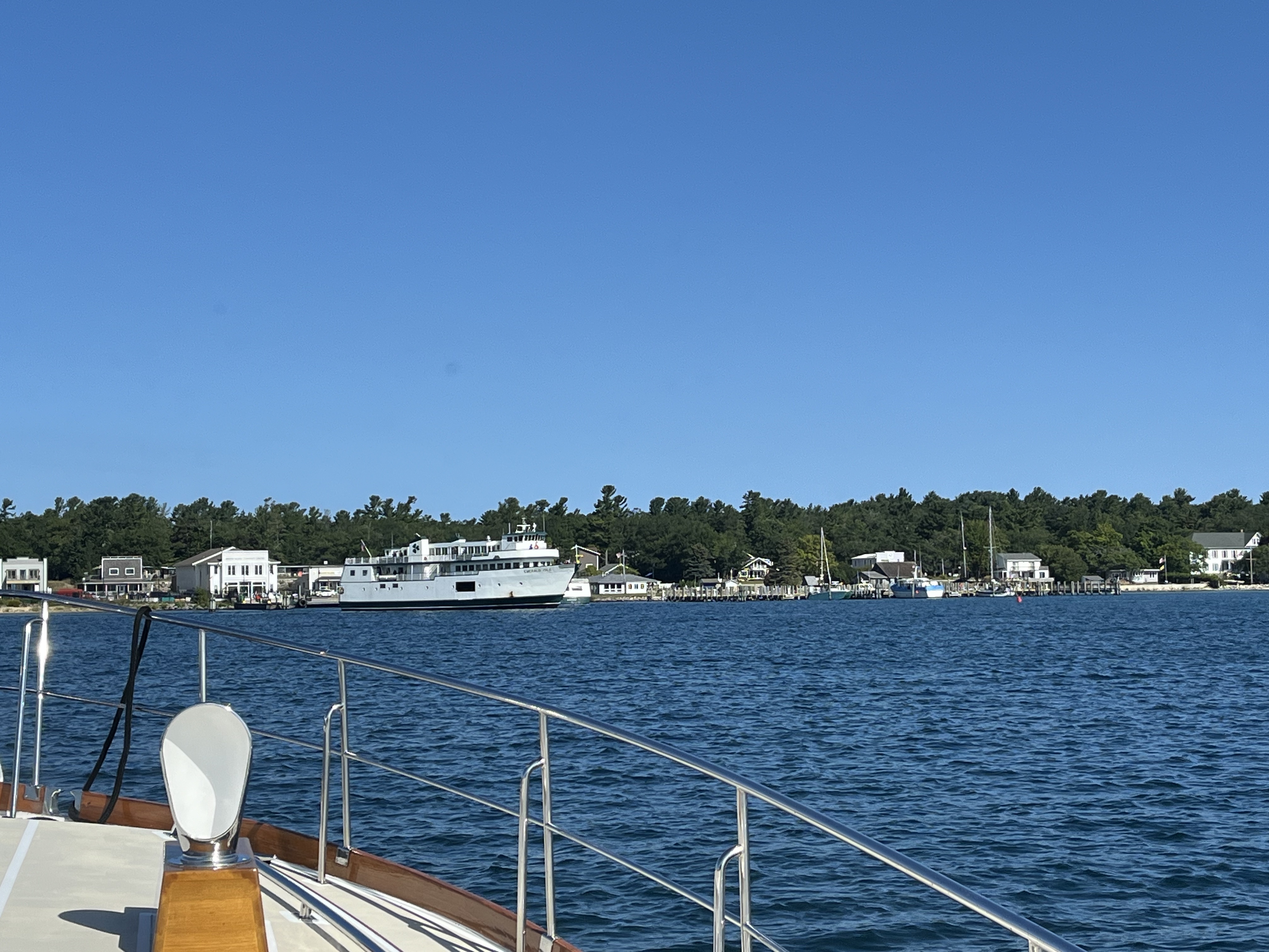 As we arrived at St. James harbor on Beaver Island, we would have to slow down and wait for the ferry to dock.