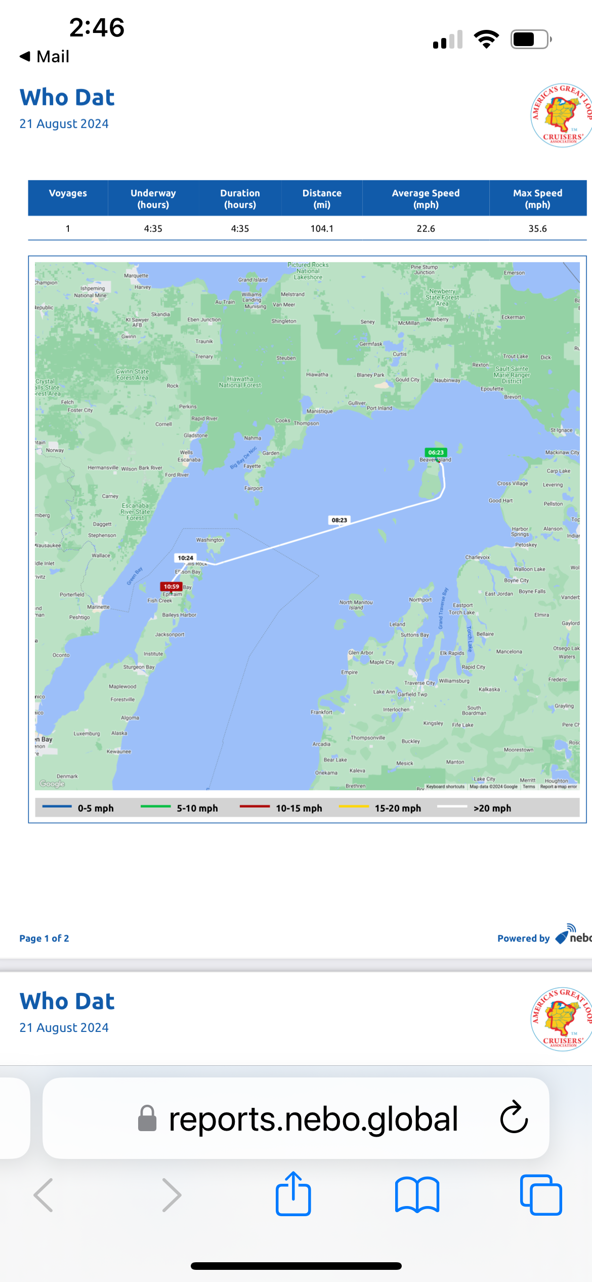 Good morning from our house in Sister Bay, WI! We “Crossed Our Wake” Wednesday 8/21/24 at 10:50am CDT after an easy lake crossing from Beaver Island to Ephraim. I will post the stats of the trip on the bottom of this post.